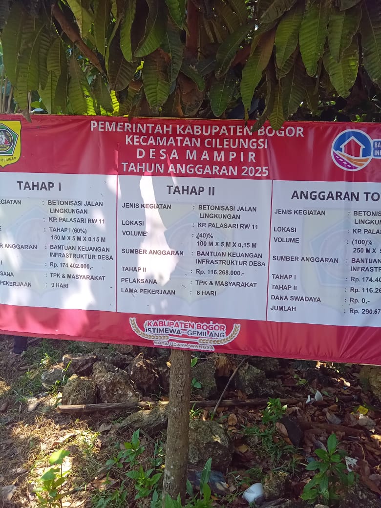 JABAR UPDATE || Pemerintah Desa Mampir, Kecamatan Cileungsi, Kabupaten Bogor, mengumumkan rampungnya proyek betonisasi jalan lingkungan di Kampung Palasari, RW 11. Proyek vital ini berhasil direalisasikan melalui Program Bantuan Keuangan Infrastruktur Desa (Bankeu) Kabupaten Bogor Tahun Anggaran 2025, menandai komitmen serius dalam peningkatan infrastruktur desa ,Total panjang pekerjaan mencapai 250 meter dengan spesifikasi teknis 5 meter lebar dan 15 cm tebal, yang kini memberikan akses jalan yang kokoh dan permanen bagi warga setempat. Proyek ini dibagi menjadi dua tahap, dengan total alokasi anggaran keseluruhan sebesar Rp 290.670.000,-.